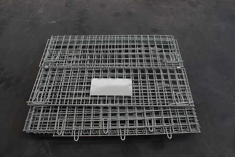 可折叠美固笼的主要原材料是高线拉成的钢丝,一般丝径是5mm,6mm,6.4mm。网片焊接的网目间距一般为50×100,100×100,50×50。仓储笼底部采用U型钢焊接而成,U型钢是冷轧带钢轧机轧制而成,底部四角采用冲压件一次冲制而成。仓储笼采用Q195高线作为原材料,经冷拔成型材。再通过碰焊形成半成品网片。在制作成网片后,可采用镀锌或喷塑进行表面处理(仓储笼大多数采用镀锌处理),表面处理完毕后就可以进行组装,即可制作成成品。